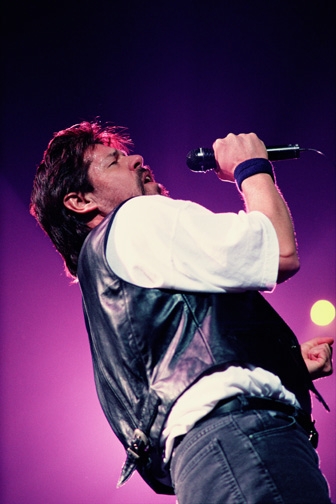 I took this shot as Bob sang "Roll Me Away" at the opening of his Detroit shows at the Palace in 1996. Looking through the lens, it was clear that Bob was thrilled by the wild audience response. Here he's belting out the song's chorus to the side stage audience from high atop the P.A. speakers -- K.S.
